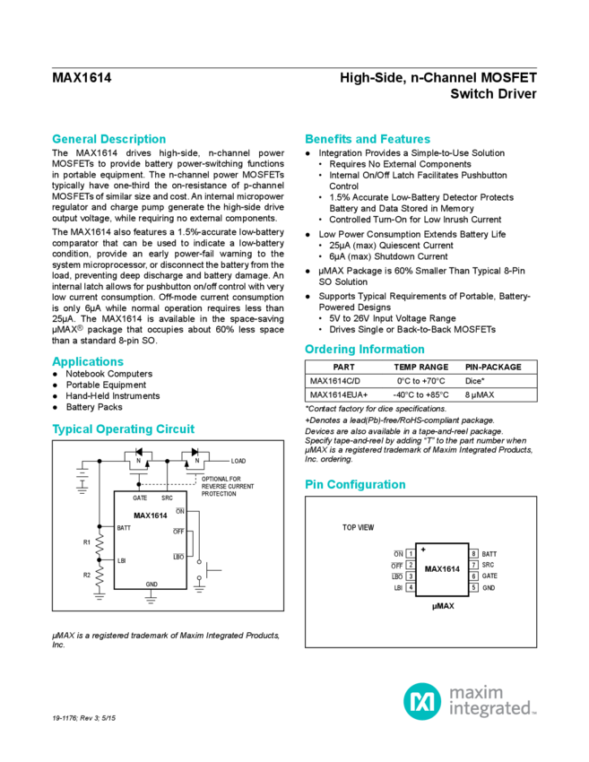 MAX1614 High-Side, N-Channel MOSFET Switch Driver