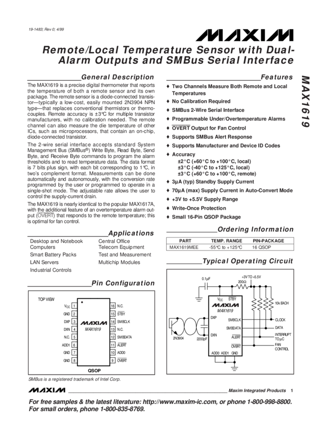 MAX1619 Remote/Local Temperature Sensor with Dual-Alarm Outputs and SMBus Serial Interface