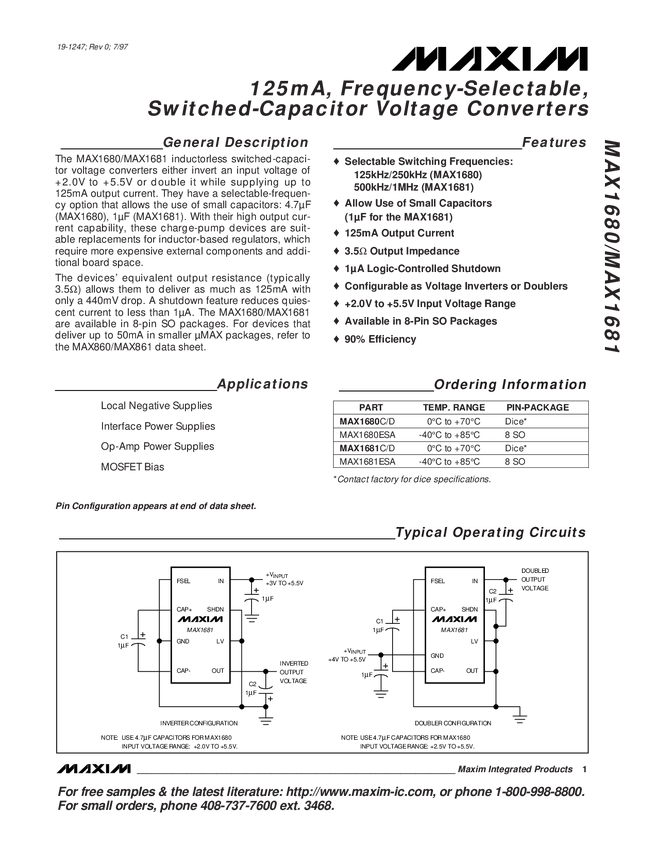 125mA, Frequency-Selectable, Switched-Capacitor Voltage Converters