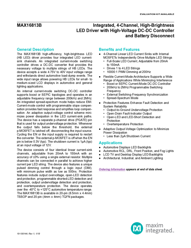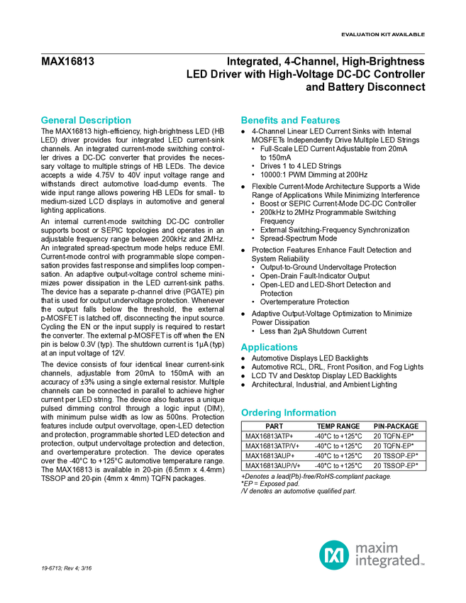 Integrated, 4-Channel, High-Brightness LED Driver with High-Voltage DC-DC Controller and Battery Disconnect