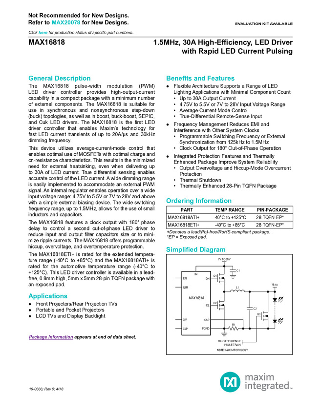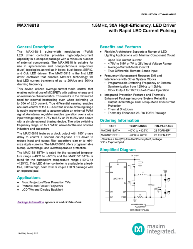 MAX16818 1.5MHz, 30A High-Efficiency LED Driver with Rapid LED Current Pulsing