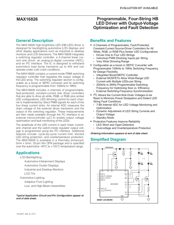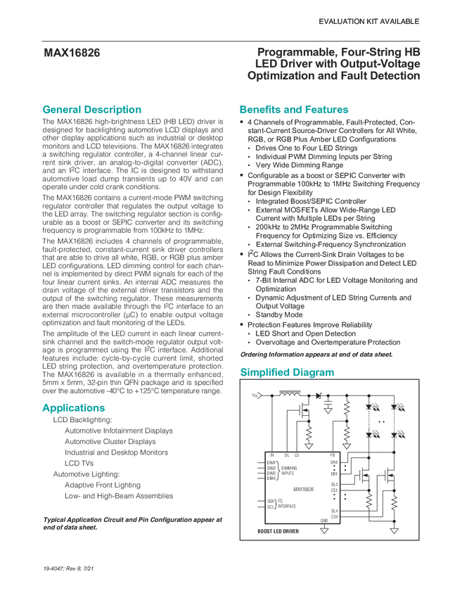 MAX16826 Programmable, Four-String HB LED Driver with Output-Voltage Optimization and Fault Detection