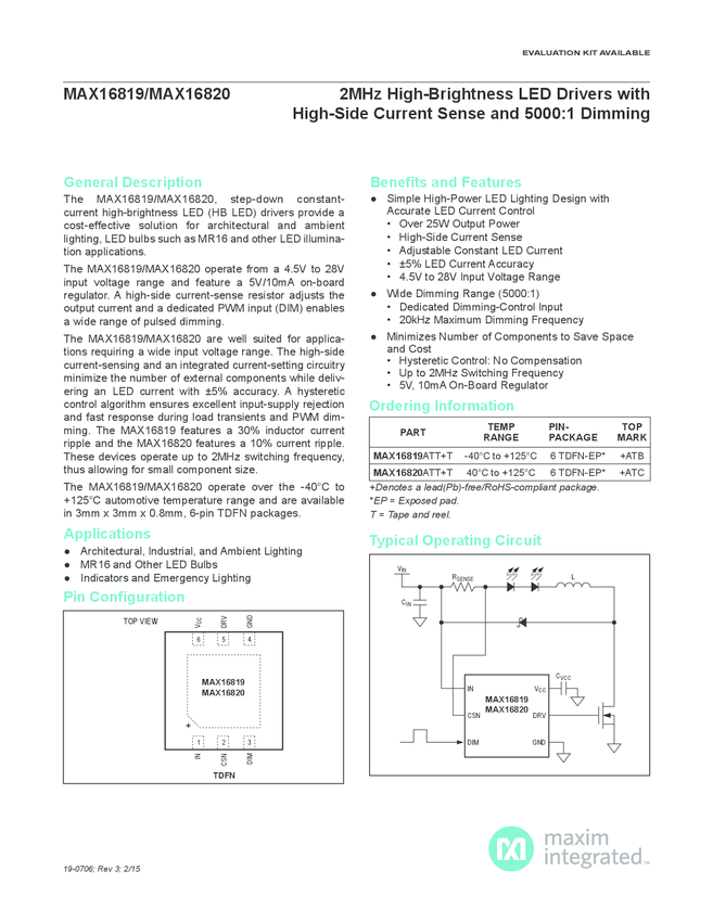 MAX16819, MAX16820 2MHz High-Brightness LED Drivers with High-Side Current Sense and 5000:1 Dimming