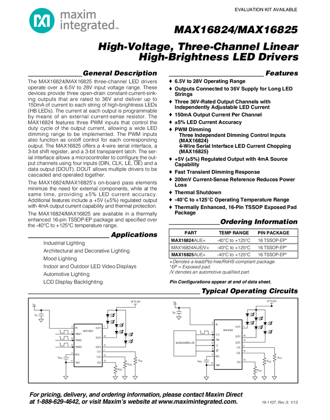 MAX16824, MAX16825 High-Voltage, Three-Channel Linear High-Brightness LED Drivers
