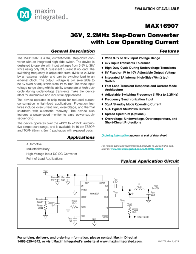 MAX16907 36V, 3A, 2.2MHz Step-Down Converter with Low Operating Current