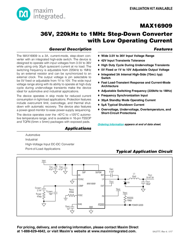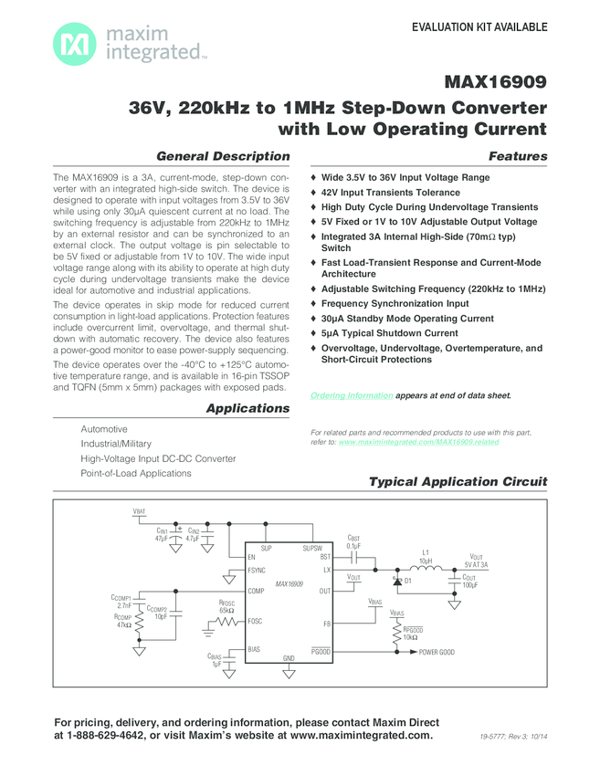 MAX16909 36V, 3A, 220kHz to 1MHz Step-Down Converter with Low Operating Current