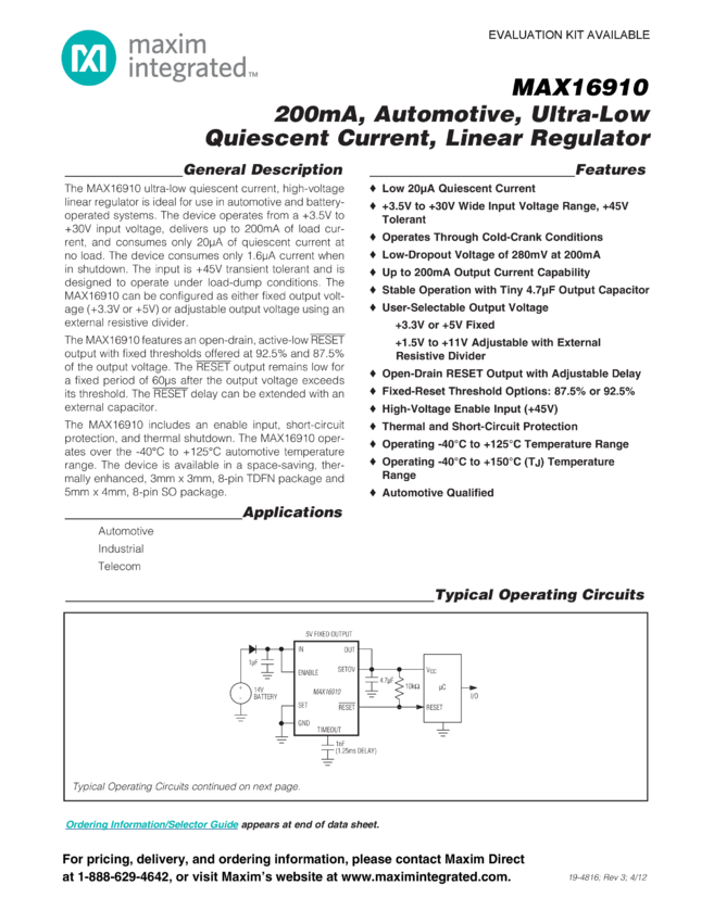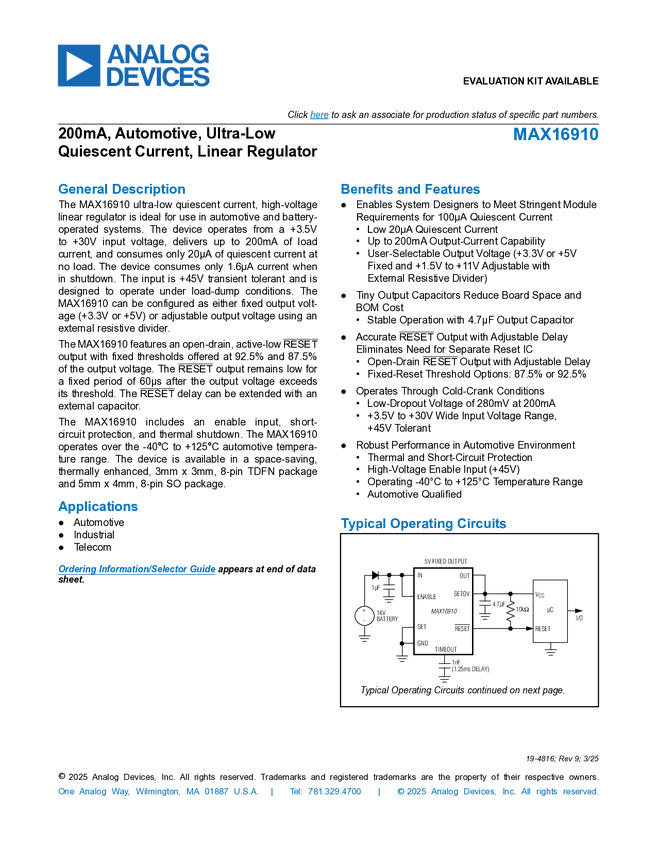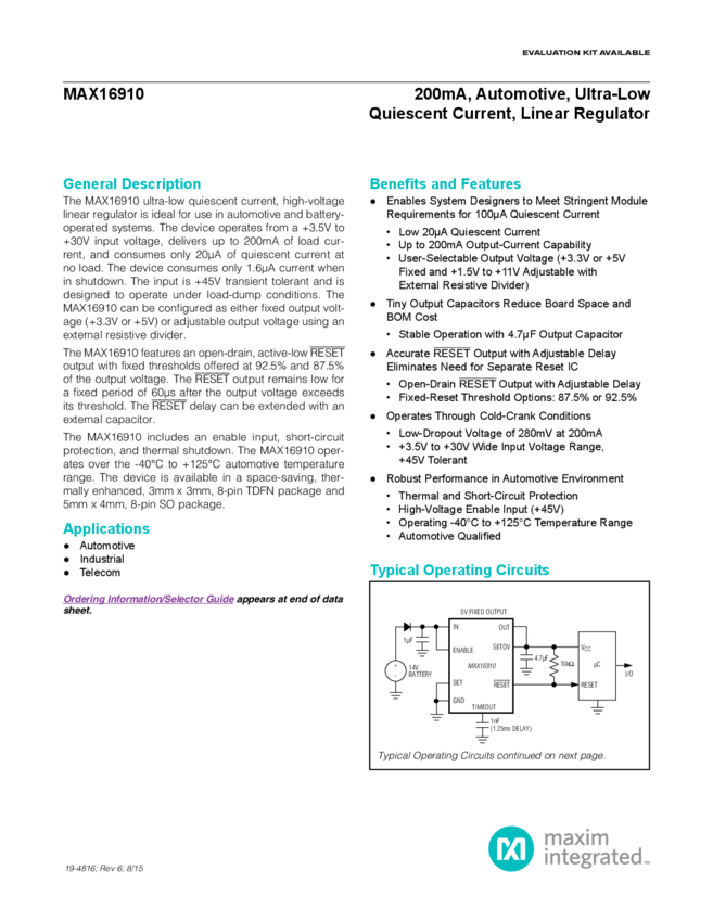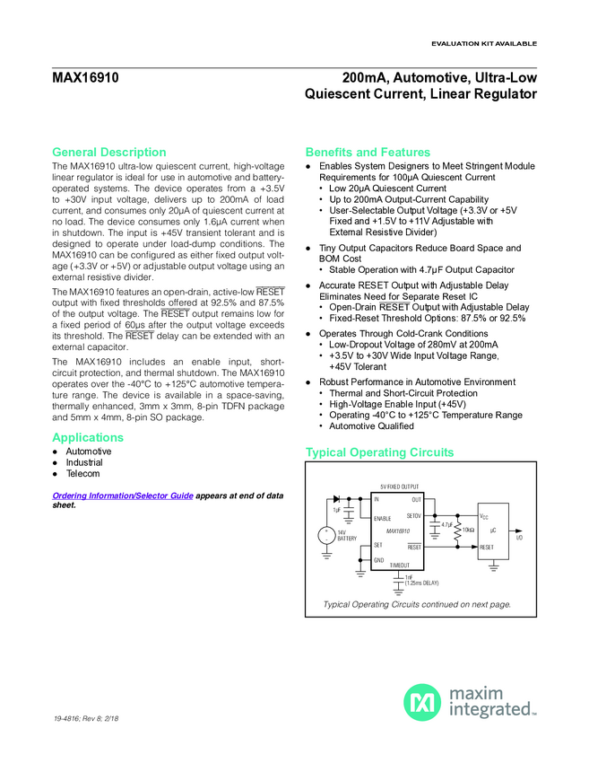 MAX16910 200mA, Automotive, Ultra-Low Quiescent Current, Linear Regulator
