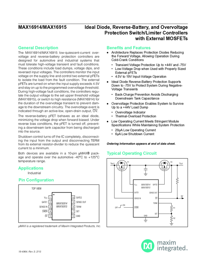 MAX16914, MAX16915 Ideal Diode, Reverse-Battery, and Overvoltage Protection Switch/Limiter Controllers with External MOSFETs