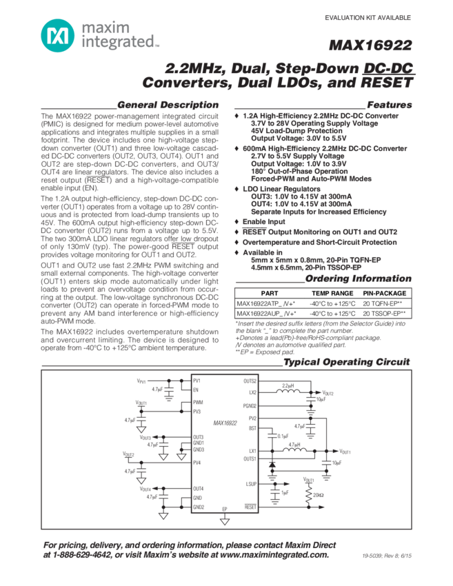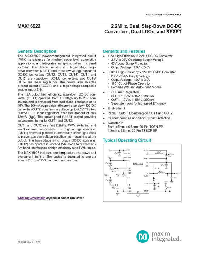 MAX16922 2.2MHz, Dual, Step-Down DC-DC Converters, Dual LDOs, and Active-Low RESET