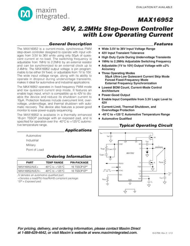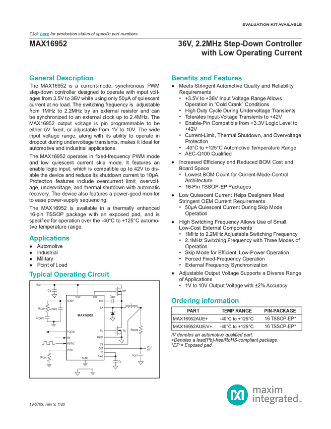 MAX16952 36V, 2.2MHz Step-Down Controller with Low Operating Current