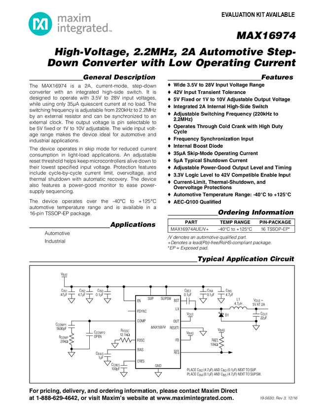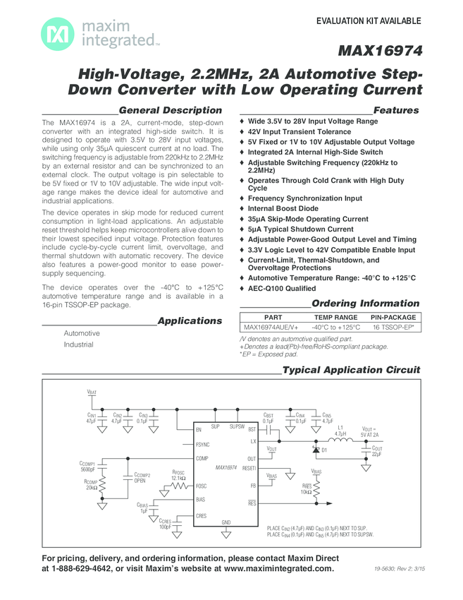 MAX16974 High-Voltage, 2.2MHz, 2A Automotive Step-Down Converter with Low Operating Current