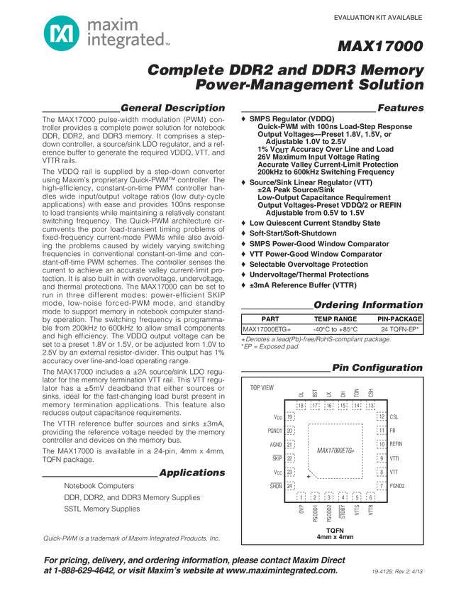 MAX17000A Complete DDR2 and DDR3 Memory Power-Management Solution