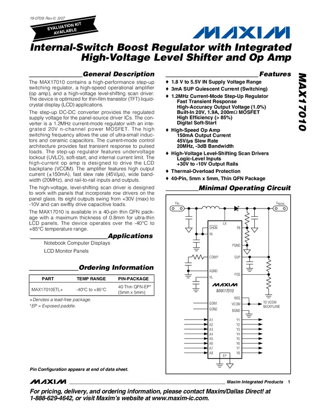 Internal-Switch Boost Regulator with Integrated High-Voltage Level Shifter and Op Amp
