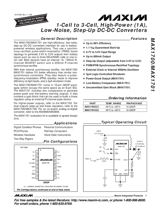 1 Cell to 3 Cell, High-Power 1A, Low-Noise, Step-Up DC-DC Converters