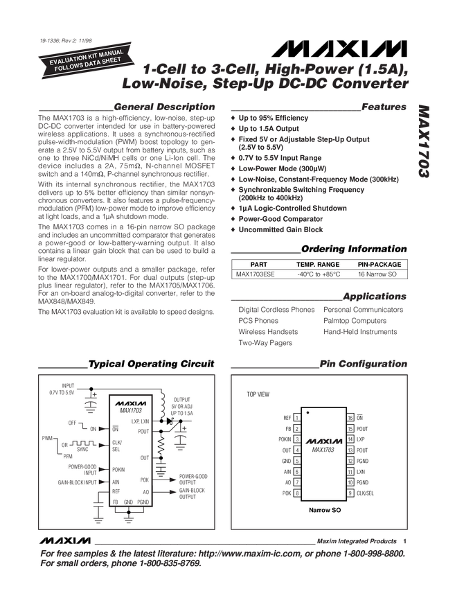 1-Cell to 3-Cell, High Power (1.5A), Low-Noise, Step-Up DC-DC Converter