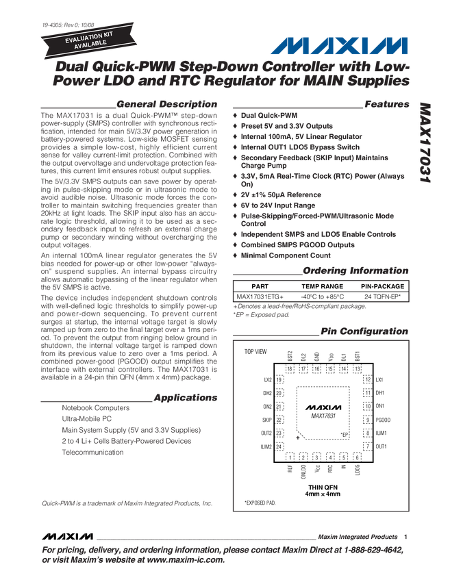Dual-Phase, Quick-PWM Controllers for IMVP-6+/IMVP-6.5 CPU Core Power Supplies