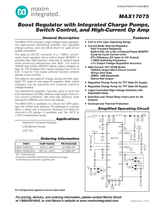 MAX17075 Boost-Regulator with Integrated Charge Pumps, Switch Control, and High-Current Op Amp