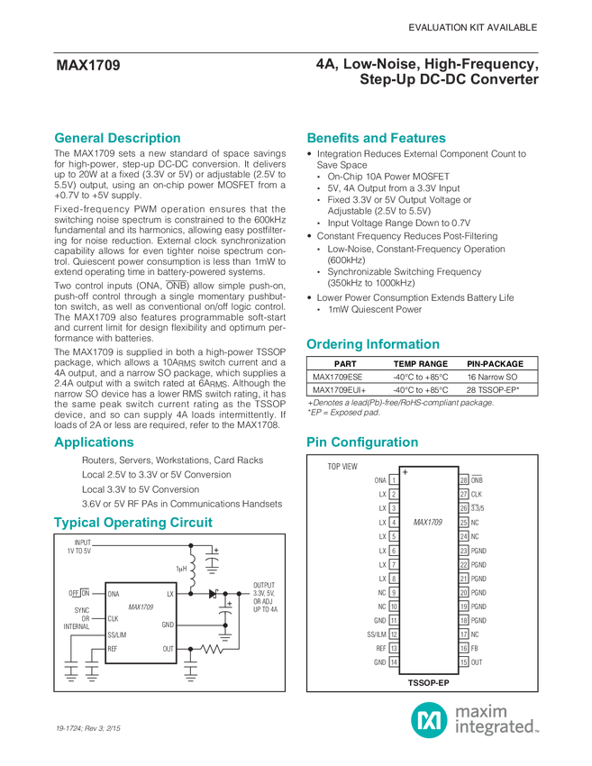 MAX1709 4A, Low-Noise, High-Frequency, Step-Up DC-DC Converter