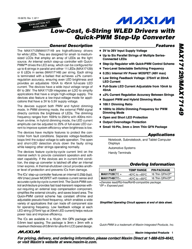 MAX17129, MAX17149 Low-Cost, 6-String WLED Drivers with Quick-PWM Step-Up Converters