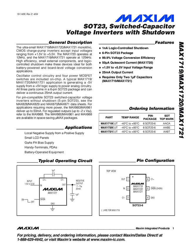 SOT23, Switched-Capacitor Voltage Inverters with Shutdown