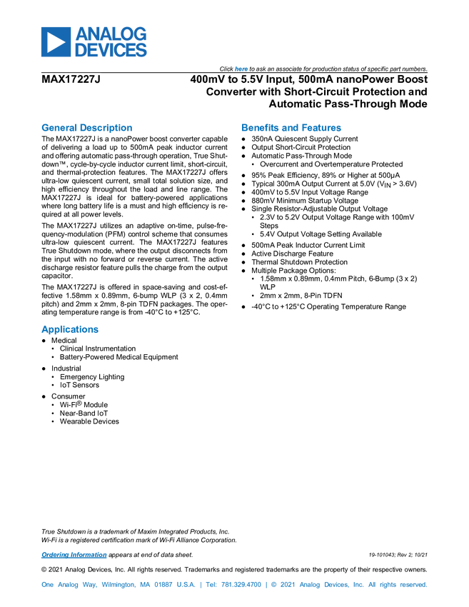 400mV to 5.5V Input, 500mA nanoPower Boost Converter with Short-Circuit Protection and Automatic Pass-Through Mode