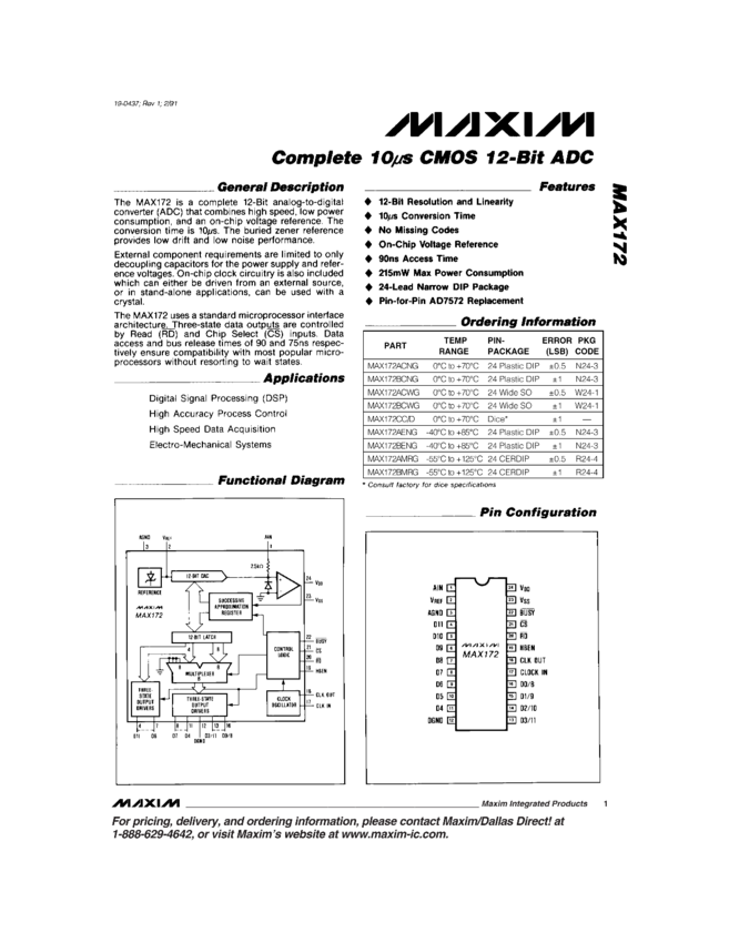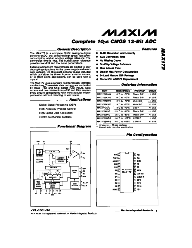 MAX172 CMOS, 10&#181s, 12-bit ADC with Reference