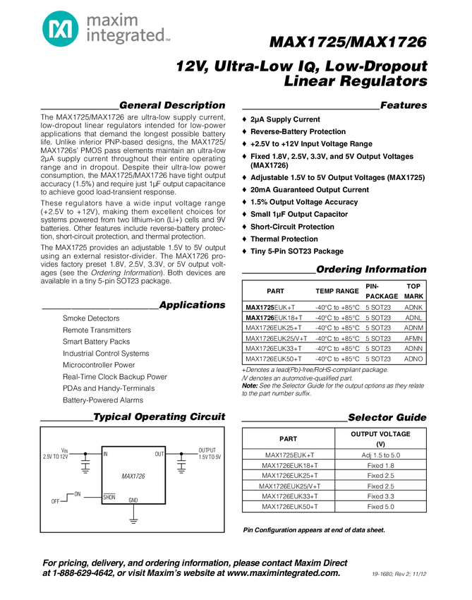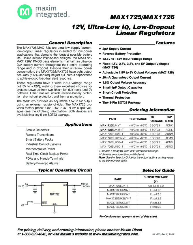 MAX1725, MAX1726 12V, Ultra-Low-IQ, Low-Dropout Linear Regulators