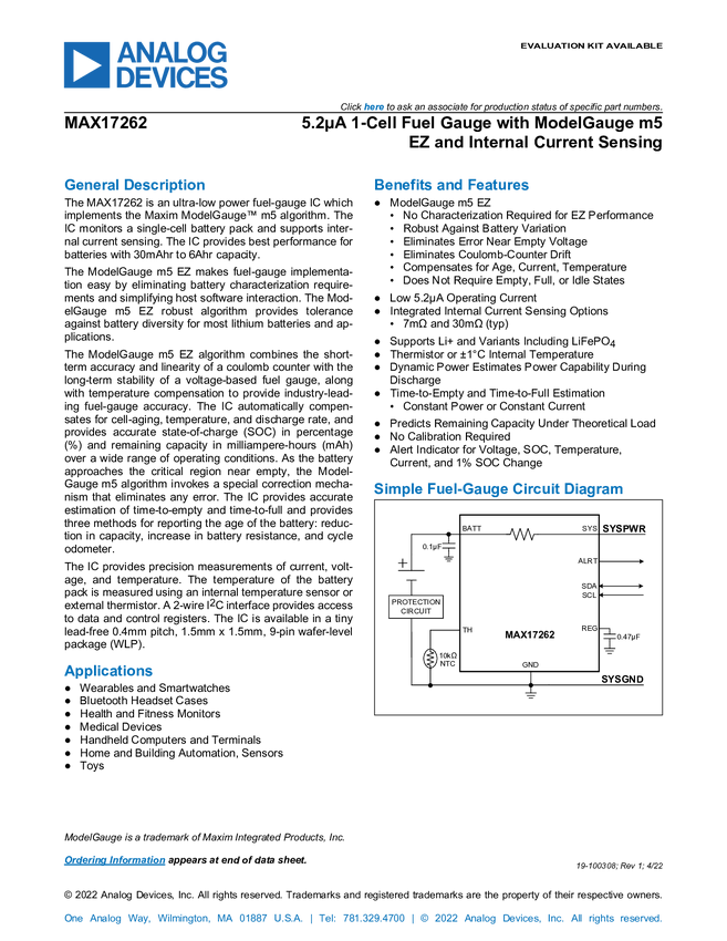 5.2µA 1-Cell Fuel Gauge with ModelGauge m5 EZ and Internal Current Sensing