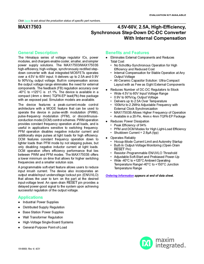 MAX17503 4.5V-60V, 2.5A, High-Efficiency, Synchronous Step-Down DC-DC Converter with Internal Compensation