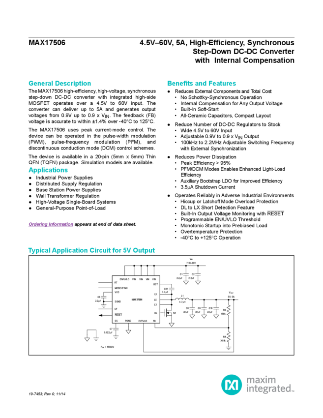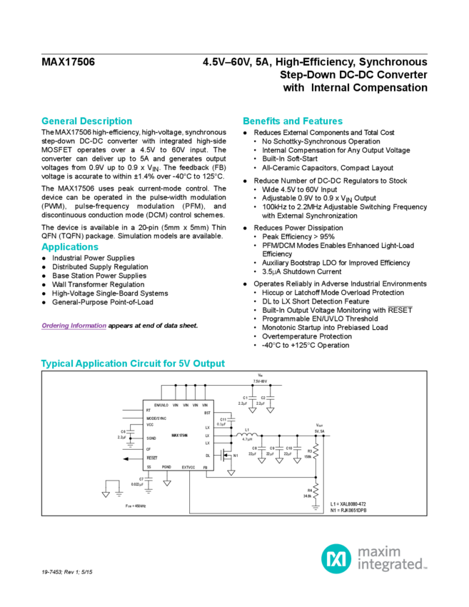 MAX17506 60V, 5A, High-Efficiency, Synchronous Step-Down DC-DC Converter with Internal Compensation