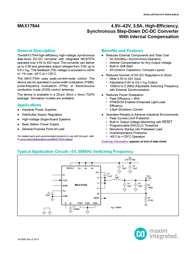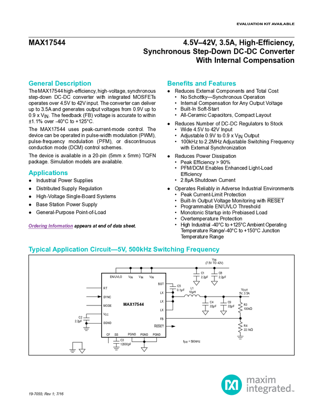 MAX17544 4.5V-42V 3.5A, High Efficiency Synchronous Step-Down DC-DC Converter with Internal Compensation