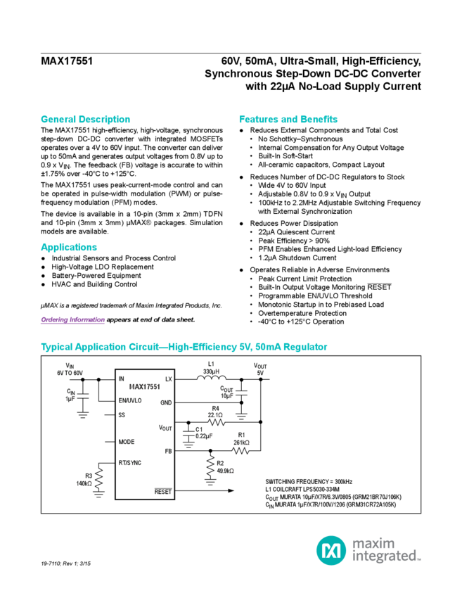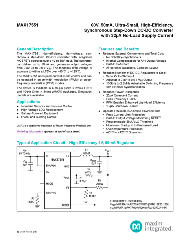 MAX17551 60V 50mA Ultra-Small High Efficiency Synchronous Step-Down DC-DC Converter with 22uA No-Load Supply Current
