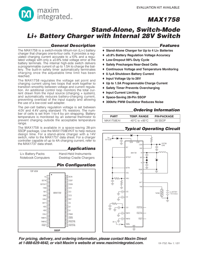 MAX1758 Stand-Alone, Switch-Mode Li+ Battery Charger with Internal 28V Switch