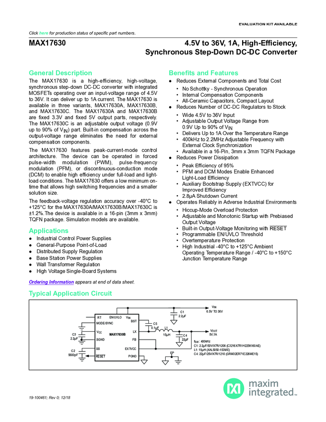 4.5V to 36V, 1A, High-Efficiency, Synchronous Step-Down DC-DC Converter
