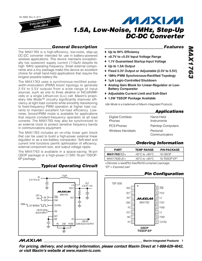 1.5A, Low-Noise, 1MHz, Step-Up DC-DC Converter