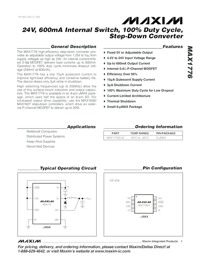 MAX1776 24V, 600mA Internal Switch, 100% Duty Cycle, Step-Down Converter for Portable Power Applications