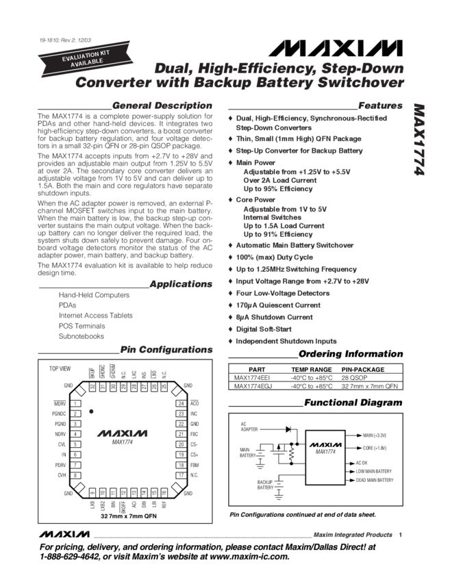 MAX1774 Dual, High-Efficiency, Step-Down Converter with Backup Battery Switchover