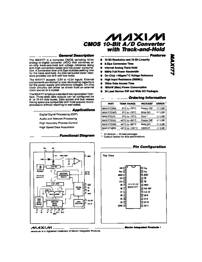 MAX177 CMOS, 12-bit ADC with Track/Hold and Reference