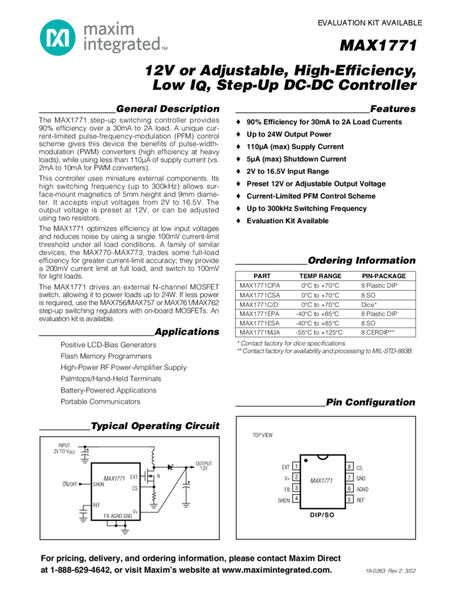 MAX1771 12V or Adjustable, High-Efficiency, Low IQ, Step-Up DC-DC Controller