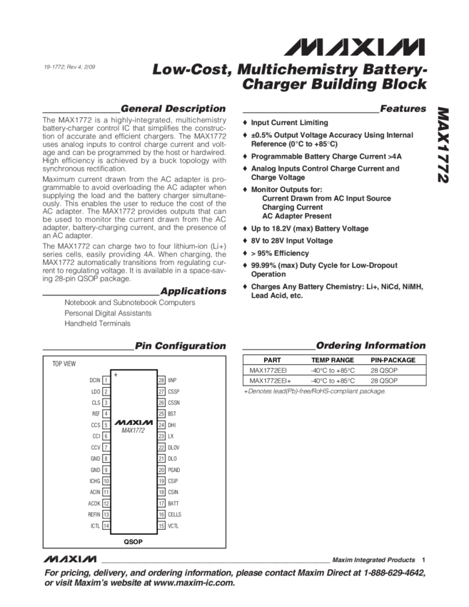 MAX1772 Low-Cost, Multichemistry Battery-Charger Building Block