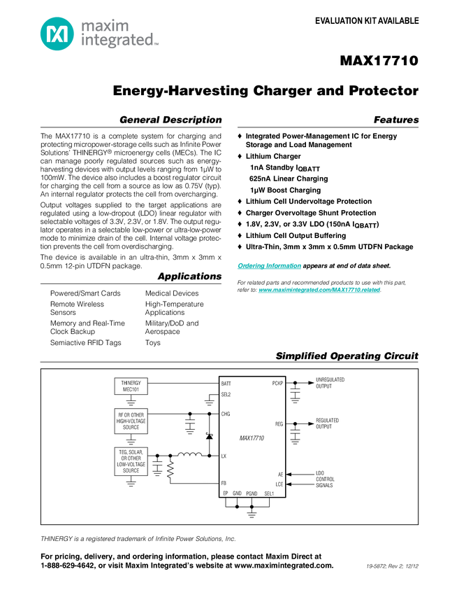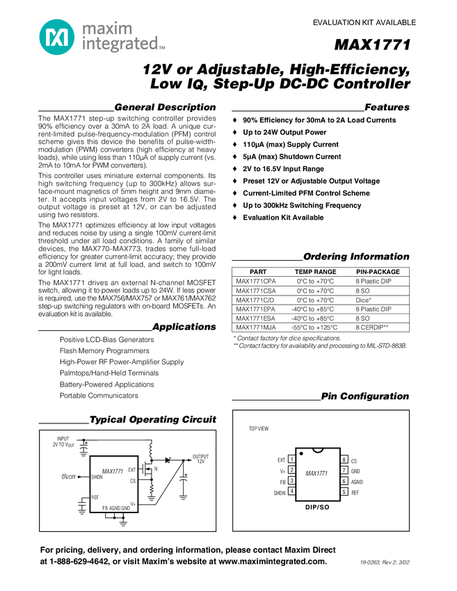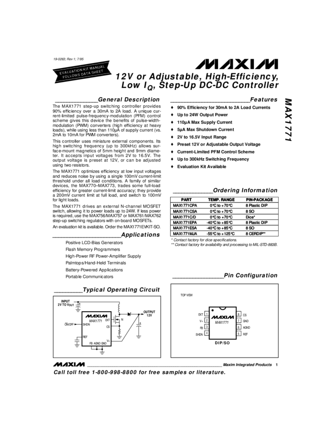 MAX1771 12V or Adjustable, High-Efficiency, Low IQ, Step-Up DC-DC Controller