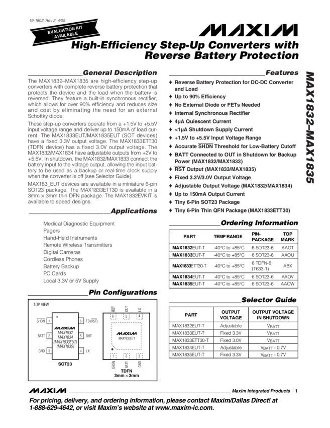 MAX1834 High-Efficiency Step-Up Converter with Reverse Battery Protection in SOT23-6