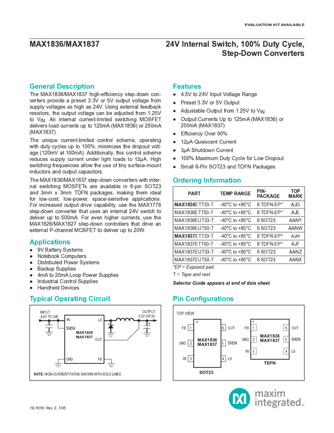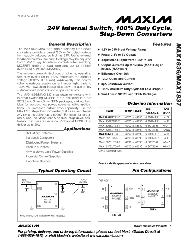 MAX1837 24V Internal Switch, 100% Duty Cycle, Step-Down Converter