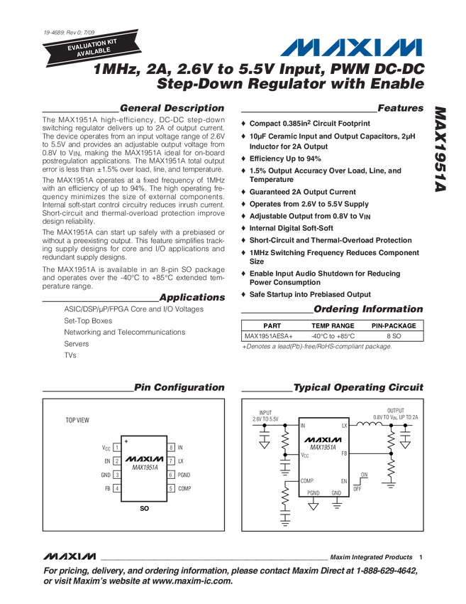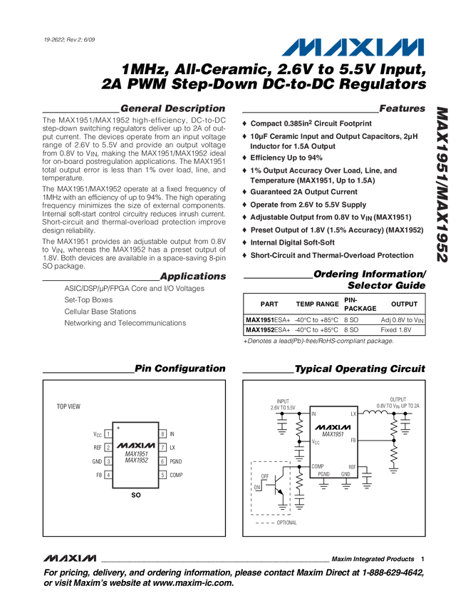 1MHz, 2A, 2.6V to 5.5V Input, PWM DC-DC Step-Down Regulator with Enable