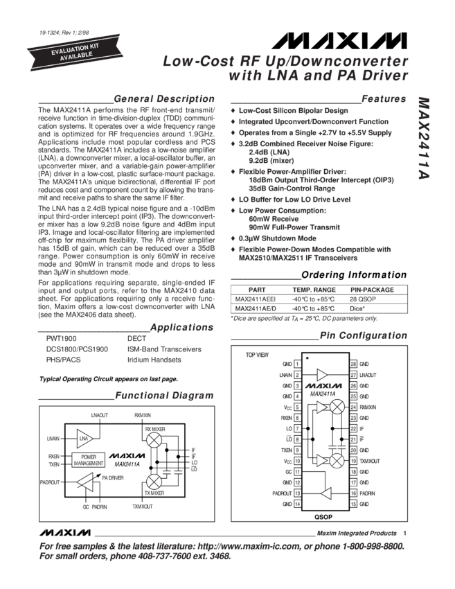 MAX2411A Low-Cost RF Up/Downconverter with LNA and PA Driver