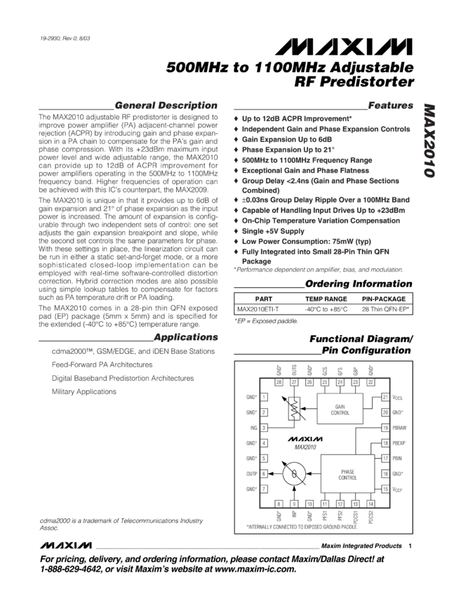 MAX2010 500MHz to 1100MHz Adjustable RF Predistorter
