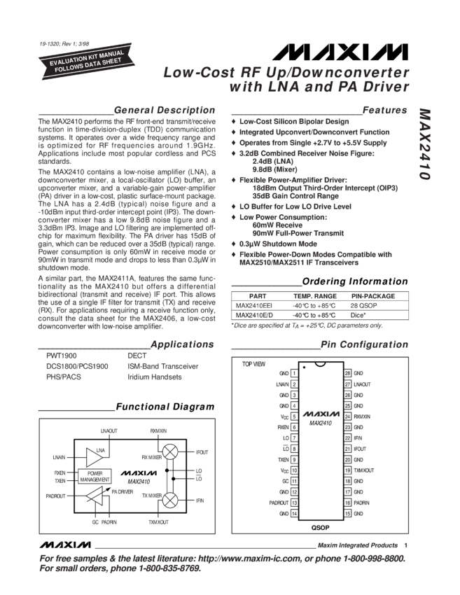 MAX2410 Low-Cost RF Up/Downconverter with LNA and PA Driver