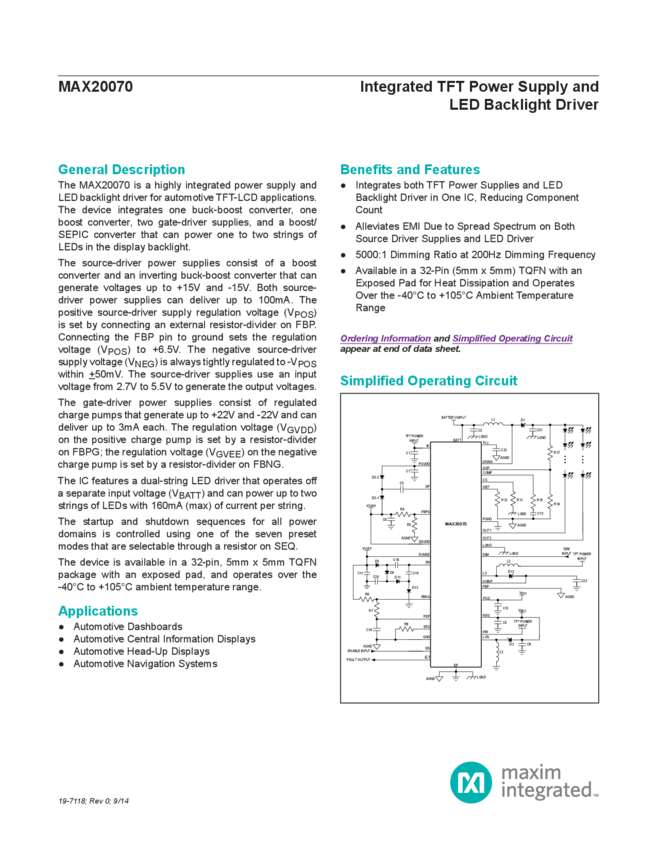 MAX20070 Integrated TFT Power Supply and LED Backlight Driver