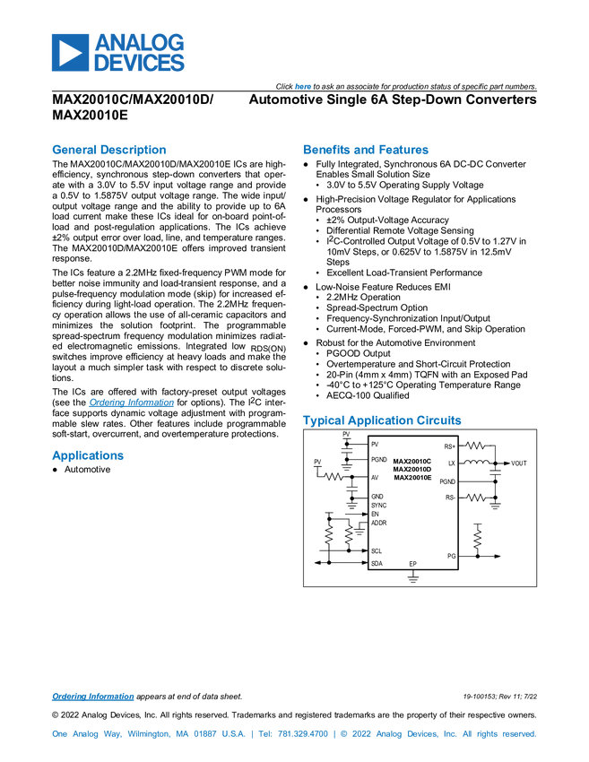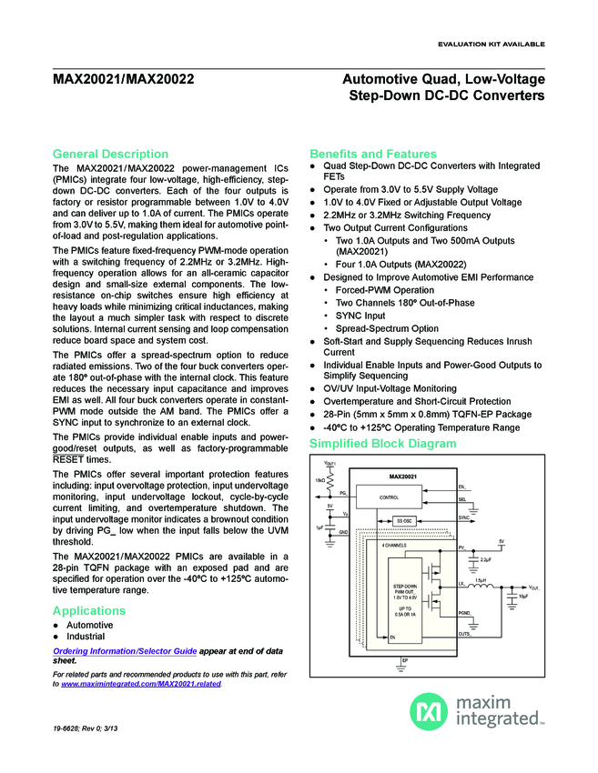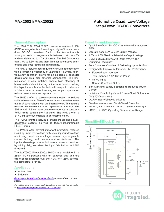 MAX20021, MAX20022 Automotive Quad, Low-Voltage Step-Down DC-DC Converters
