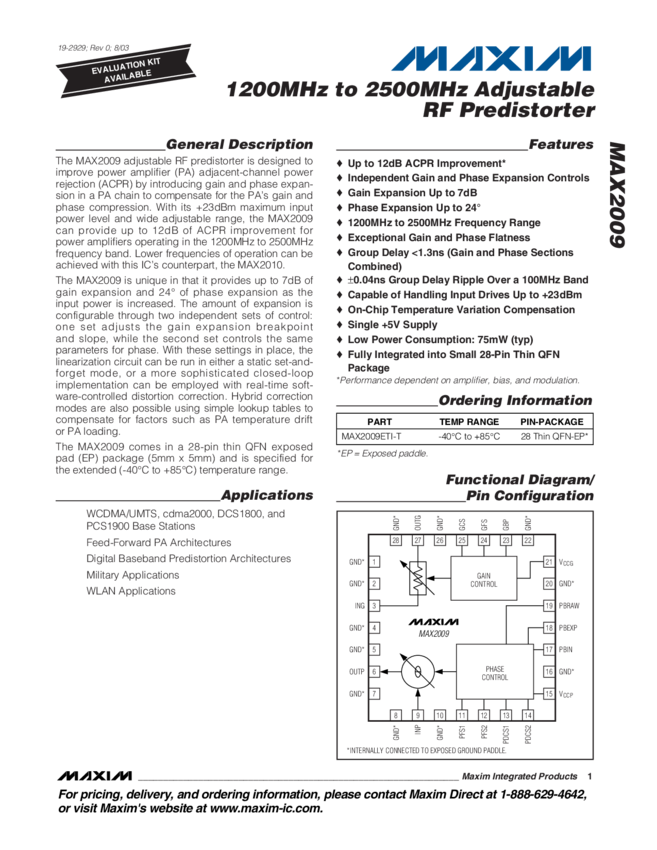 MAX2009 1200MHz to 2500MHz Adjustable RF Predistorter